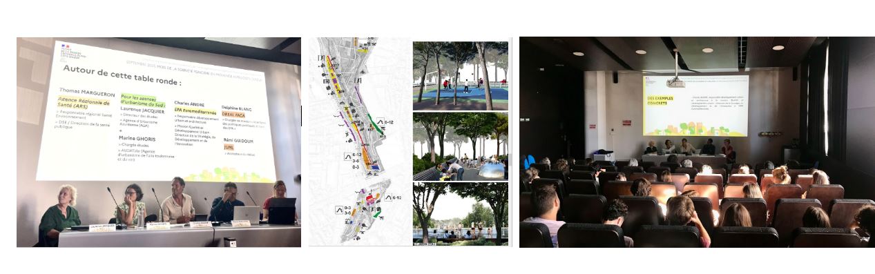 La deuxième partie a laissé la voix à l’AUDAT.VAR et à l’AUA pour présenter le travail des agences d’urbanisme de la région autour d’un travail de fiches-outils thématiques visant à concilier sobriété foncière et urbanisme favorable à la santé. Au travers d’une présentation générale du travail, puis la présentation de deux axes thématiques parmi 7, les agences ont démontré comment aller au-delà des idées reçues et concilier qualité du cadre de vie, santé et densité.