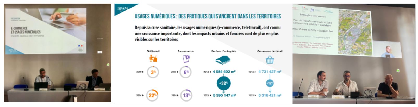 Une première partie nous a éclairé sur des changements de pratiques sur nos territoires, avec une présentation de l’AGAM (Laurent Couture) autour de l’e-commerce et ses répercussions foncières, puis avec la restitution par la DDTM des Bouches-du-Rhône (Julien Langumier) d’une étude sur les déplacements des ménages vers les pôles commerciaux (étude CEREMA).