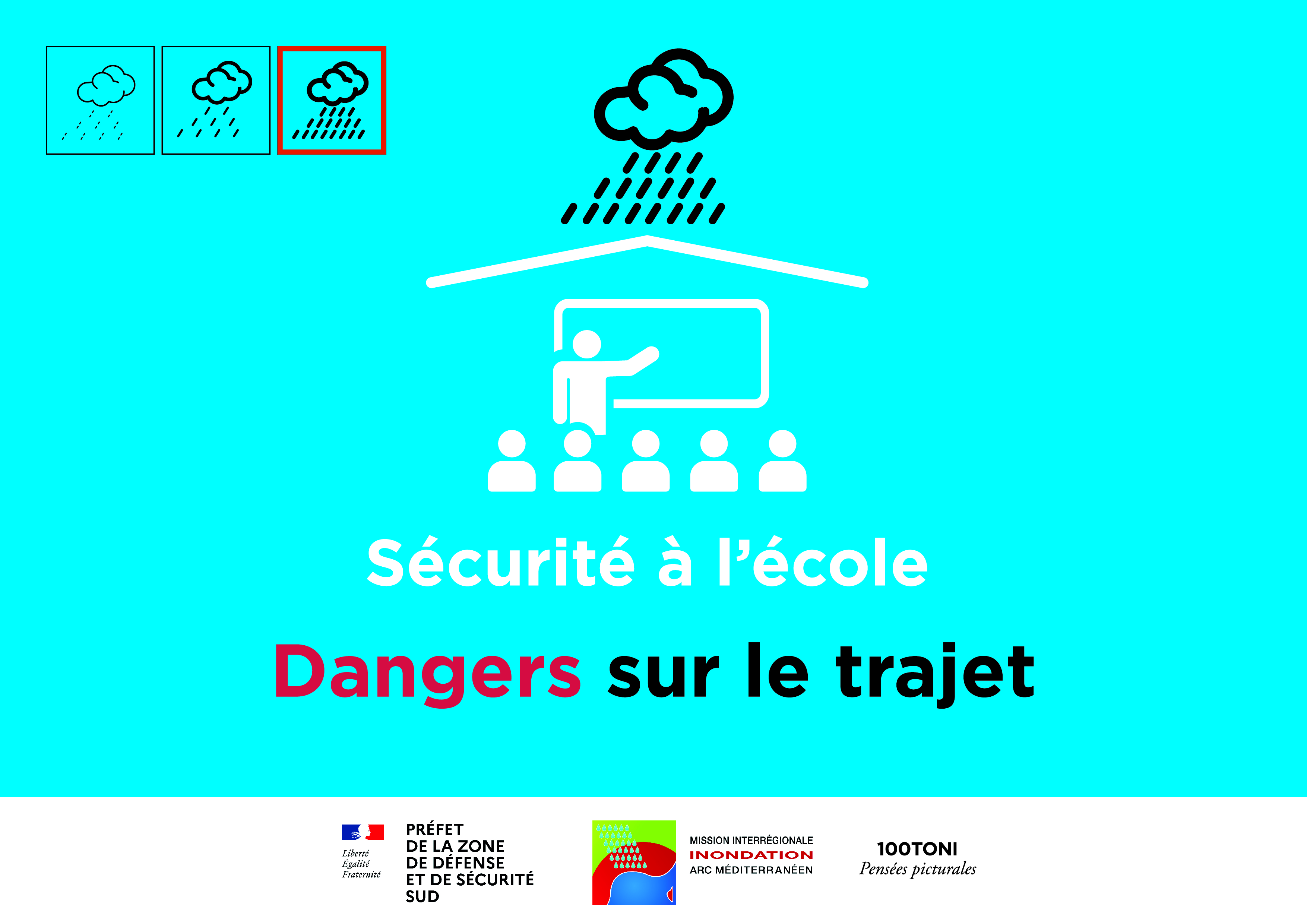 L’art comme vecteur pédagogique : La Mission Interrégionale « Inondation Arc Méditerranéen » (MIIAM) de la DREAL de zone de défense et de sécurité sud a fait appel à l’artiste 100toni pour réinterpréter certaines consignes en cas de pluies intenses méditerranéennes dans une série de « pensées picturales » face aux risques d’inondation sur l’arc méditerranéen.}