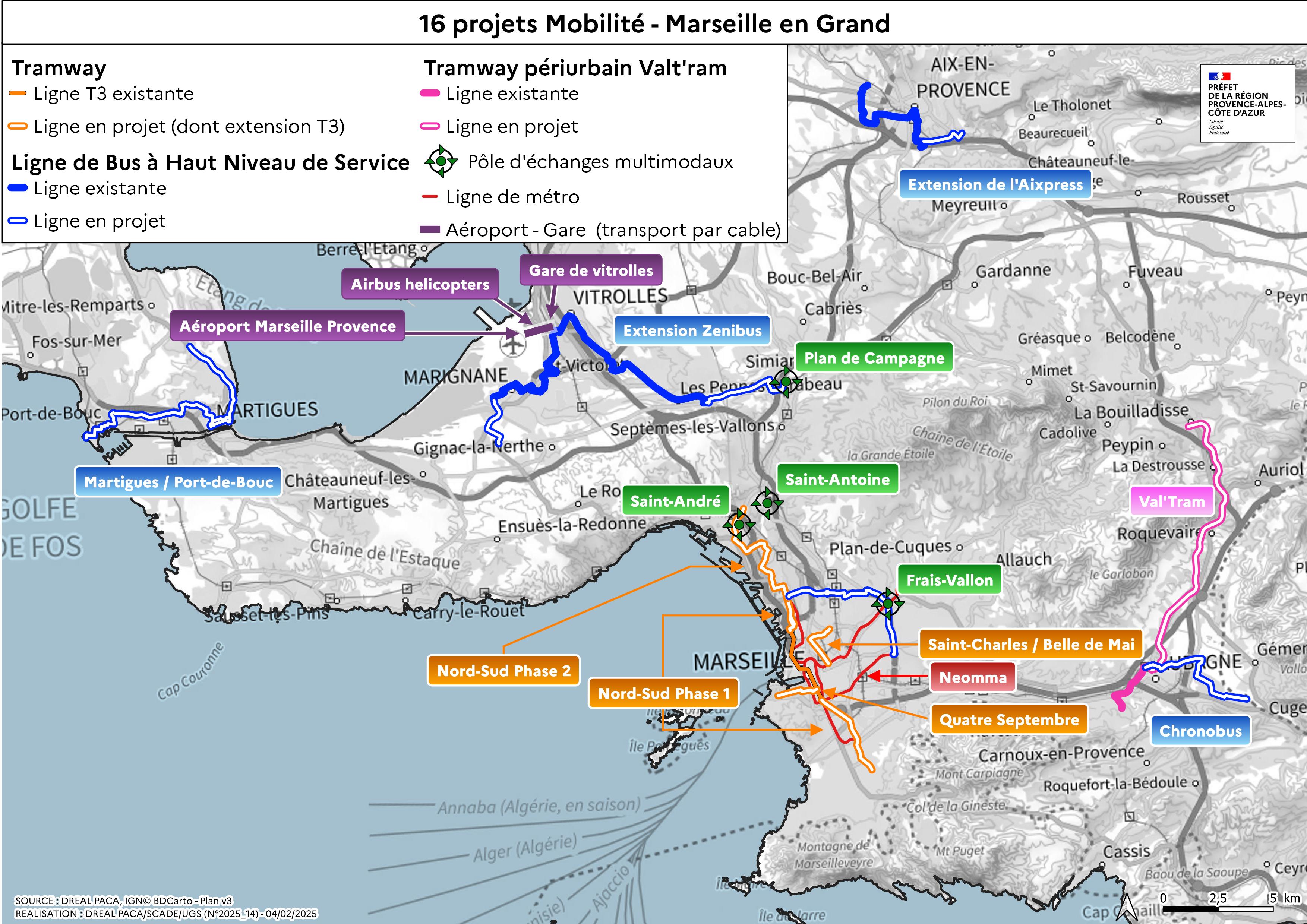 Outre l’amélioration du réseau de métro de Marseille via son automatisation, 5 projets de création ou d’extension de tramway, 5 projets de lignes de Bus à Haut Niveau de Service, ainsi que l’aménagement de 4 projets de pôles d’échanges multimodaux, sont ainsi répartis sur l’ensemble du territoire métropolitain.