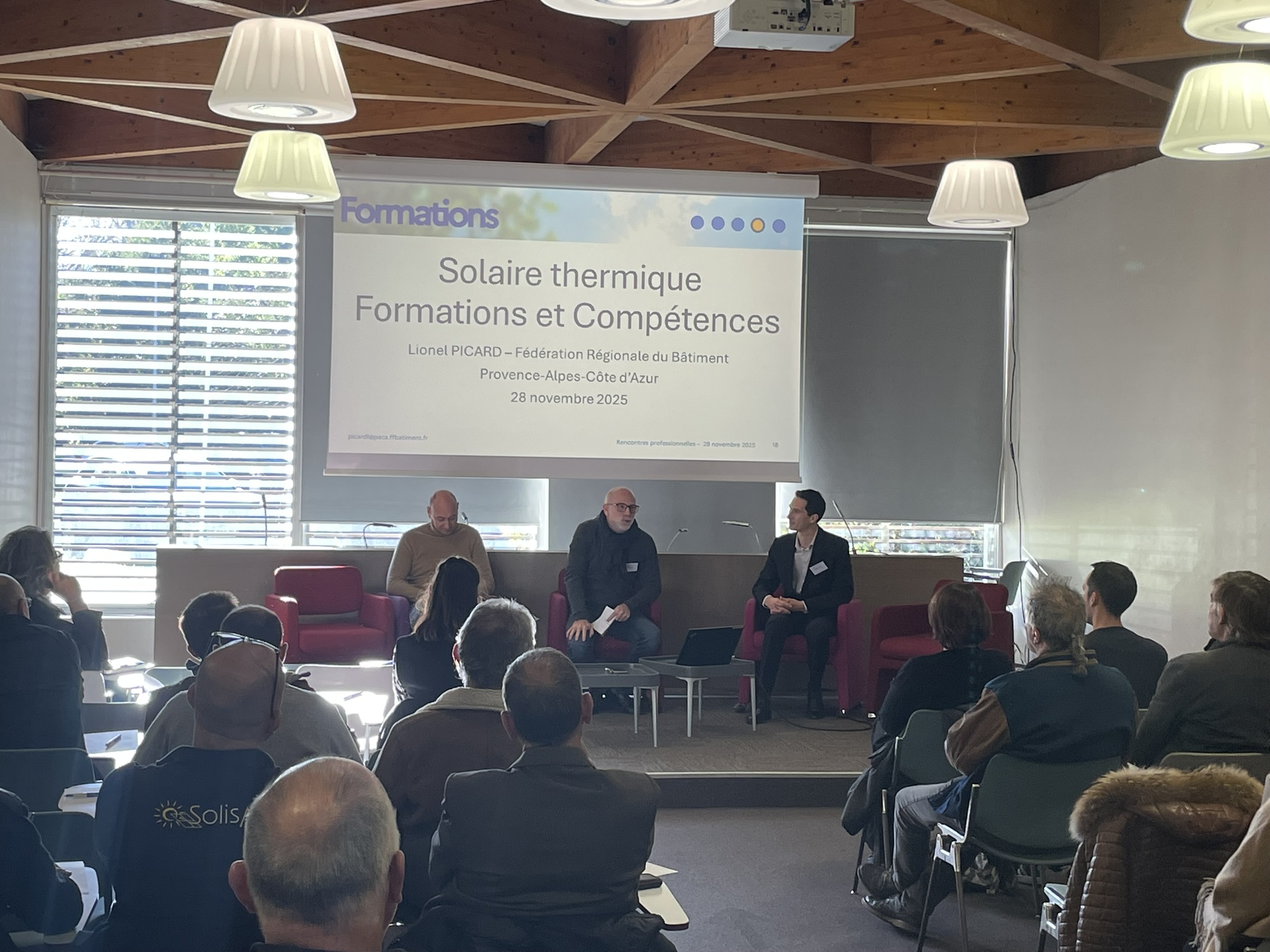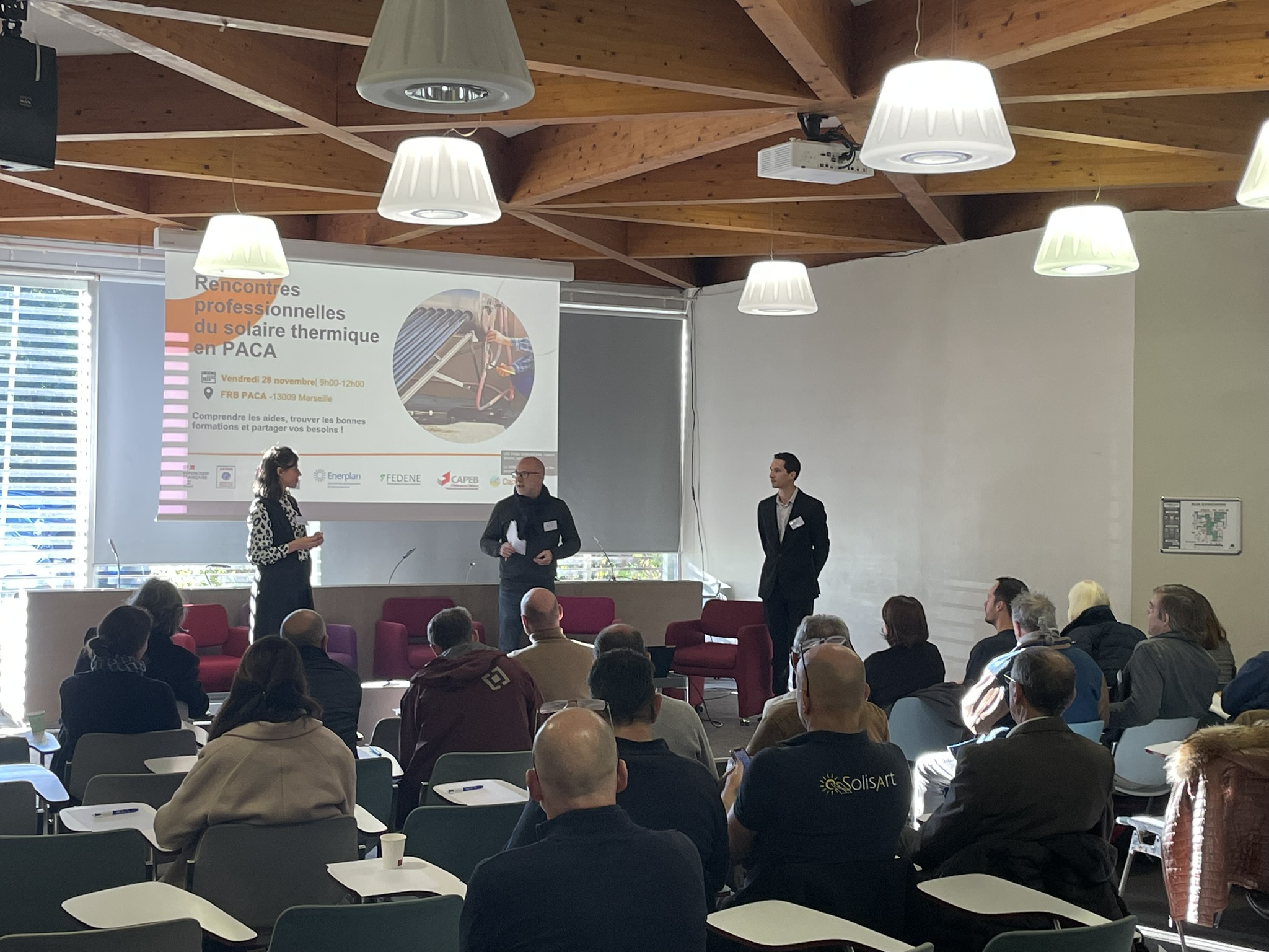 Une quarantaine de participants, installateurs, fournisseurs, bureaux d’études, exploitants, financeurs et quelques maîtres d’ouvrages ont été accueillis à la Maison du Bâtiment, à Marseille, où la Fédération régionale du Bâtiment Provence-Alpes-Côte d’Azur nous a mis à disposition ces locaux pour l’occasion.