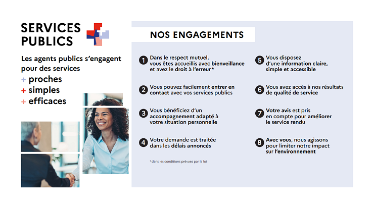 c’est la promesse faite aux usagers à travers des engagements communs à atteindre. Les administrations les déclinent pour les préciser et les adapter à leurs métiers et à leurs enjeux particuliers. Ils sont partagés avec les usagers dans les points de contact et sur les sites internet